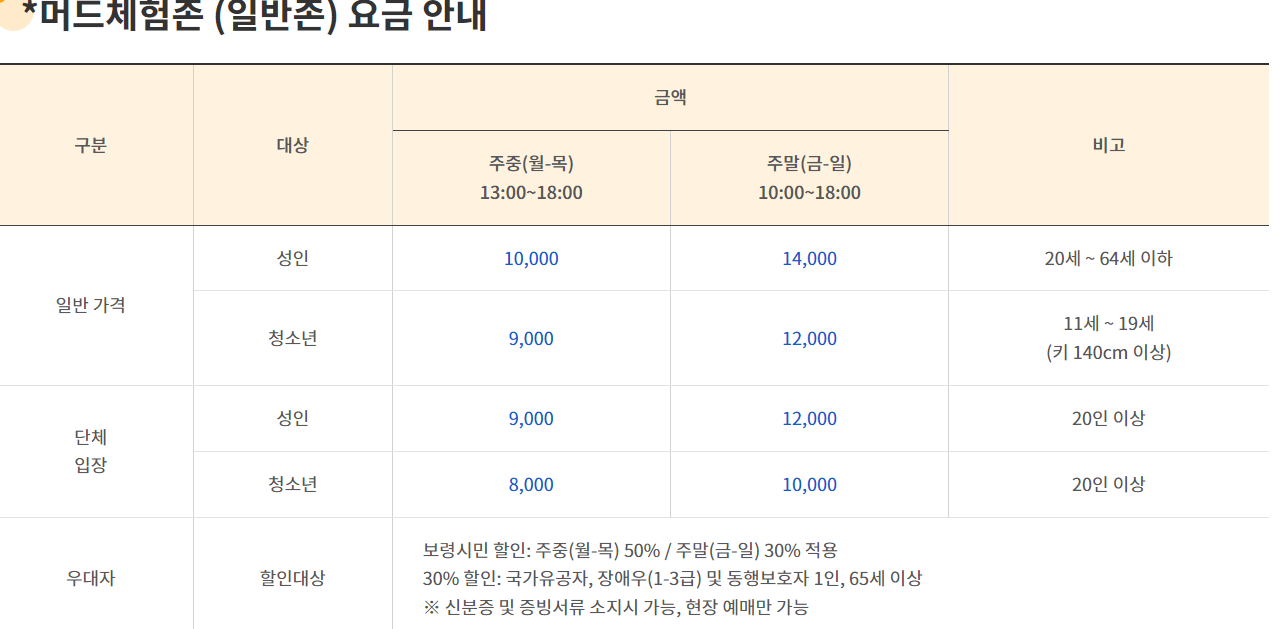 축제 기간동안 입장료는 무료이지만 머드체험존은 사전 예약이 필요합니다.